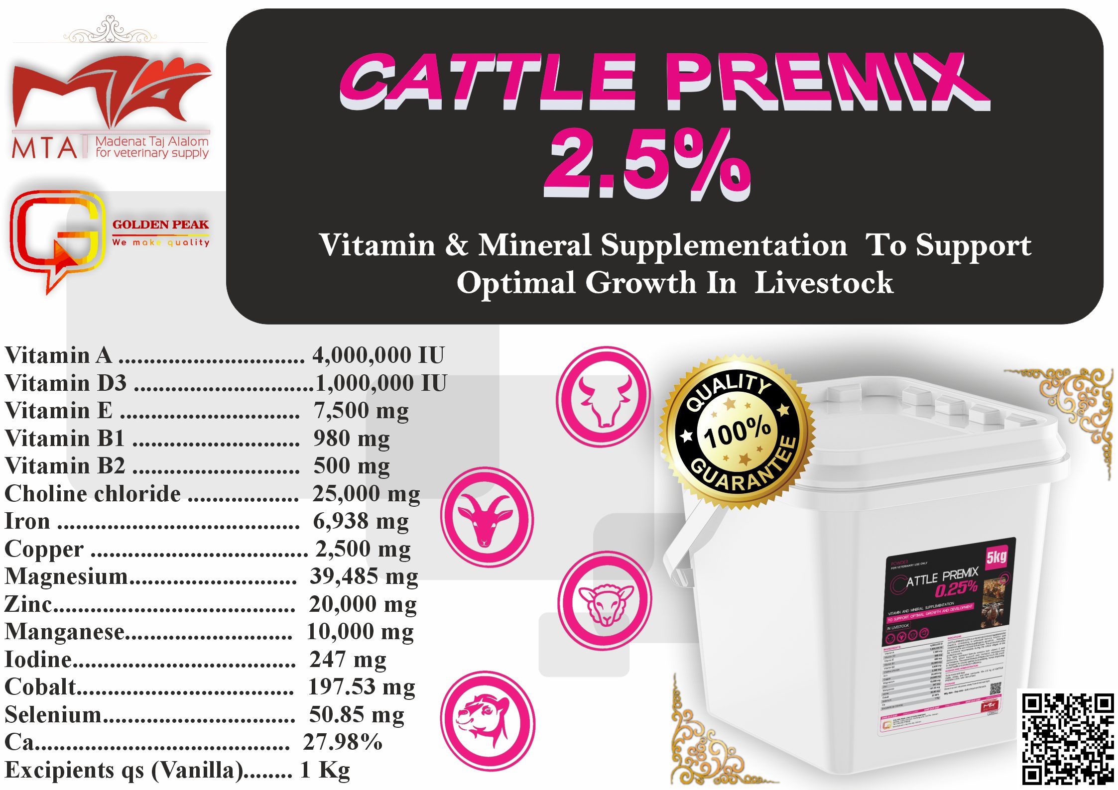 CATTLE PREMIX 0.25% is a vitamin and mineral supplement for livestock, contributing to enhanced immune function and resistance against infectious pathogens, as well as helping to prevent vitamin and mineral deficiencies. This product provides